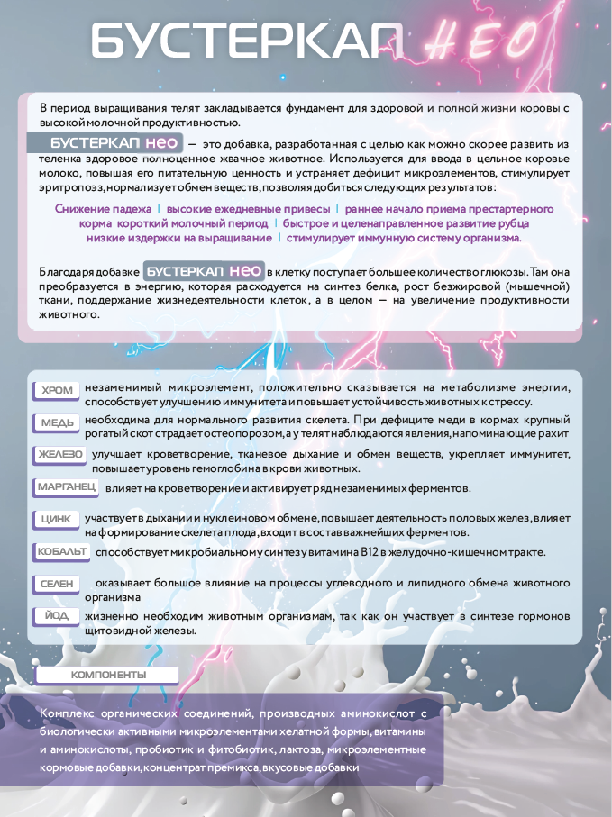 БУСТЕРКАП это добавка, разработанная с целью как можно скорее развить из теленка здоровое полноценное жвачное животное. Используется для ввода в цельное коровье молоко, повышая его питательную ценность и устраняет дефицит микроэлементов, стимулирует эритропоэз, нормализует обмен веществ.